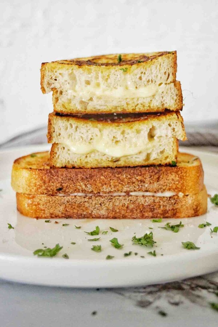 Grilled cheese stacked on a white plate with text written between 2 images.