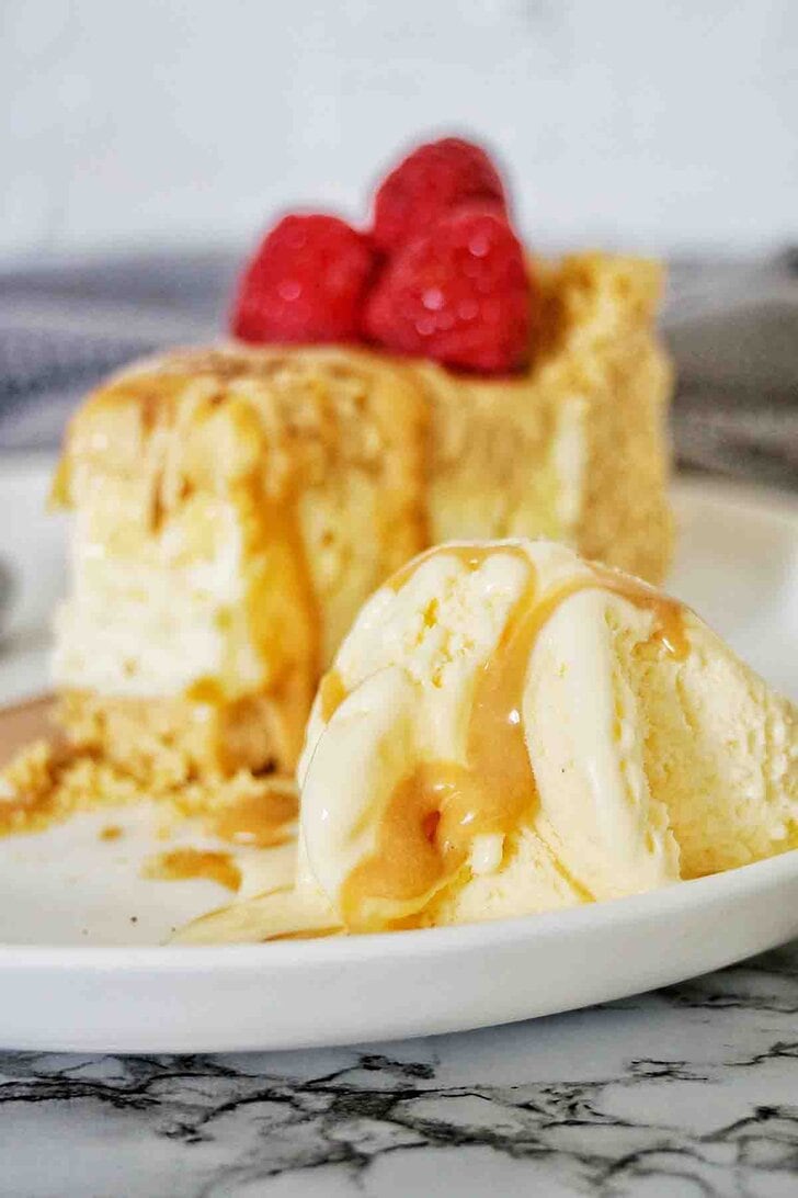Piece of caramel cheesecake on white plate with ice cream and raspberries.