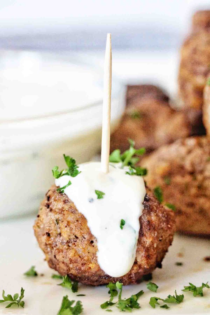 • To serve: plate the meatballs on a serving platter. Provide toothpicks and a small bowl of the horseradish yogurt sauce. Sprinkle over some finely chopped parsley for presentation.